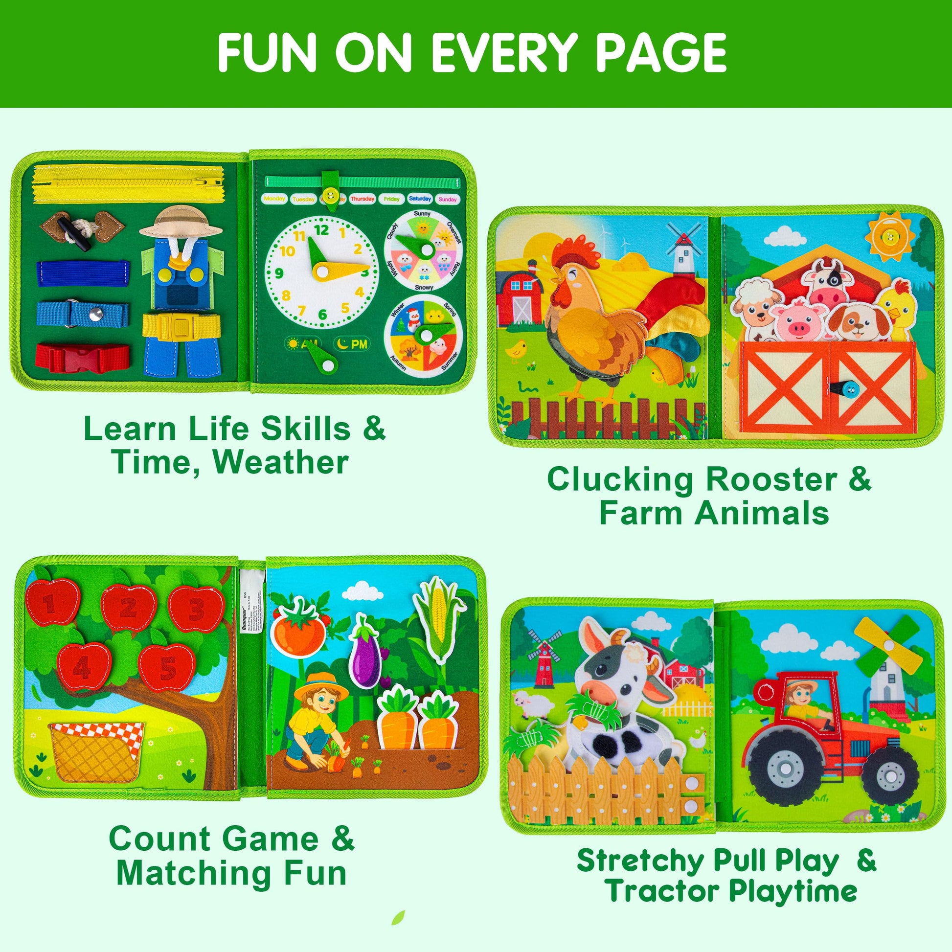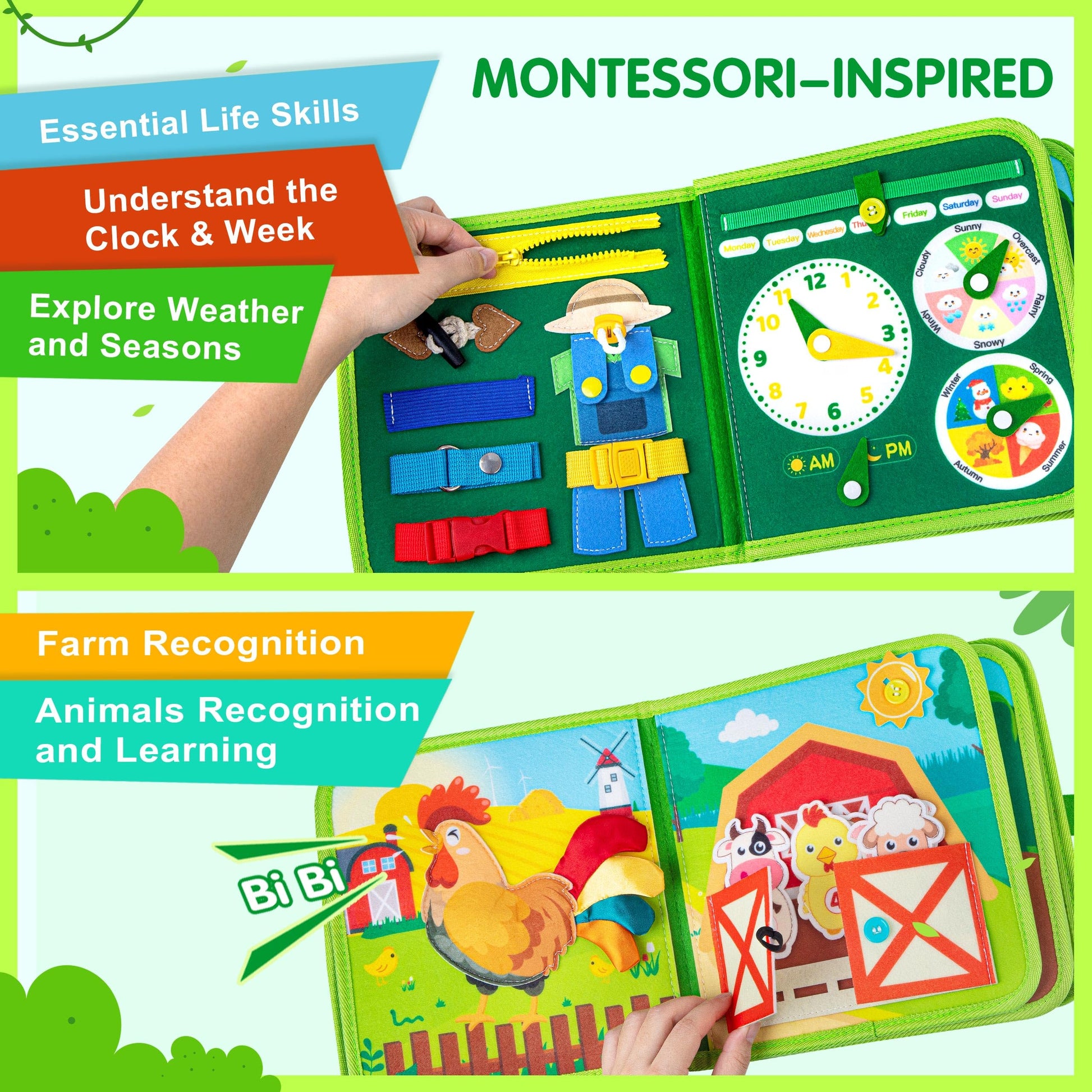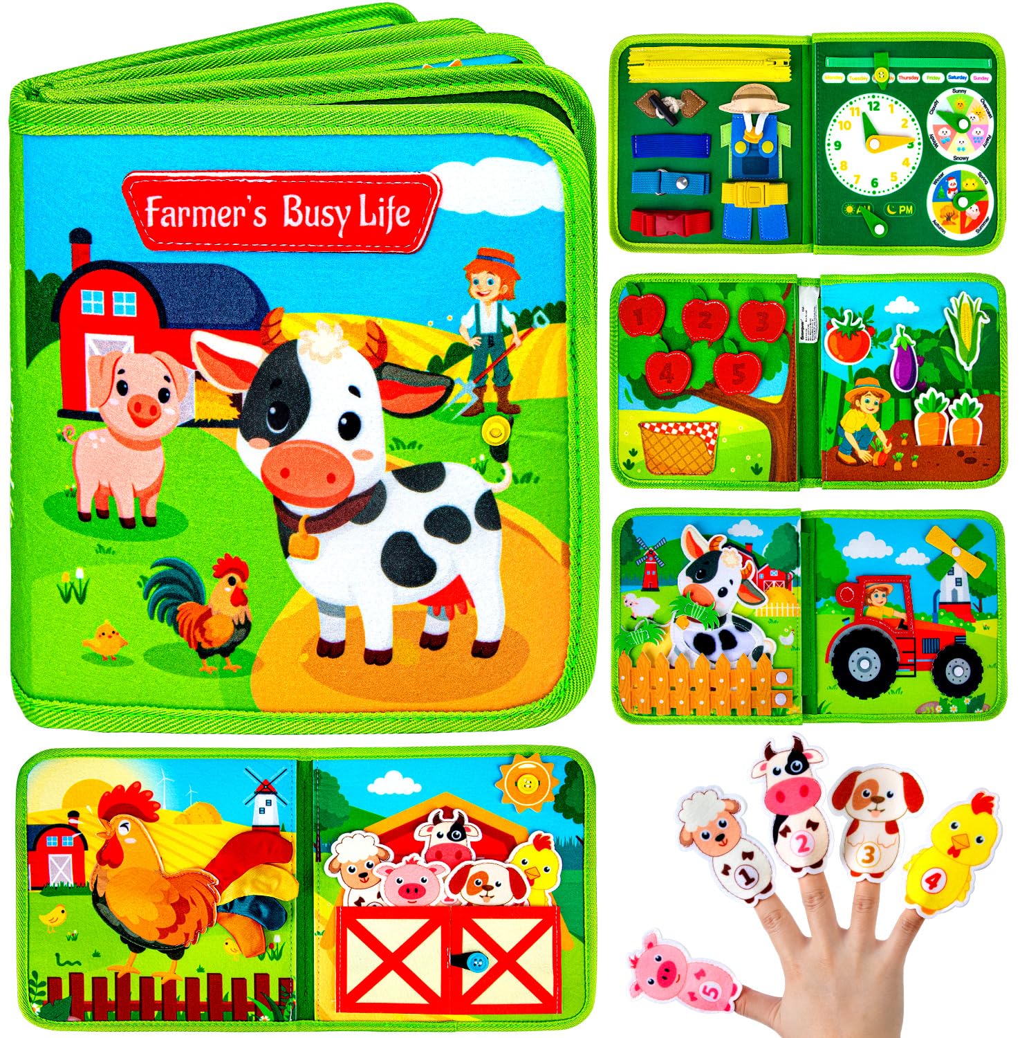 Quanquer Montessori Busy Book for Toddlers 1-3 - Farm Animal Sensory Busy Board for 1 Year Old Boys and Girls, Educational Travel Toy for Airplane Car Activities, Birthday Christmas Toddler Gifts